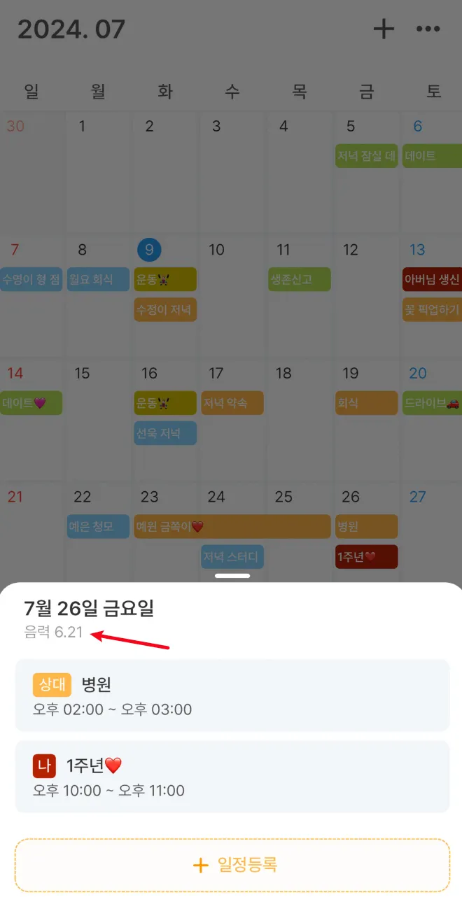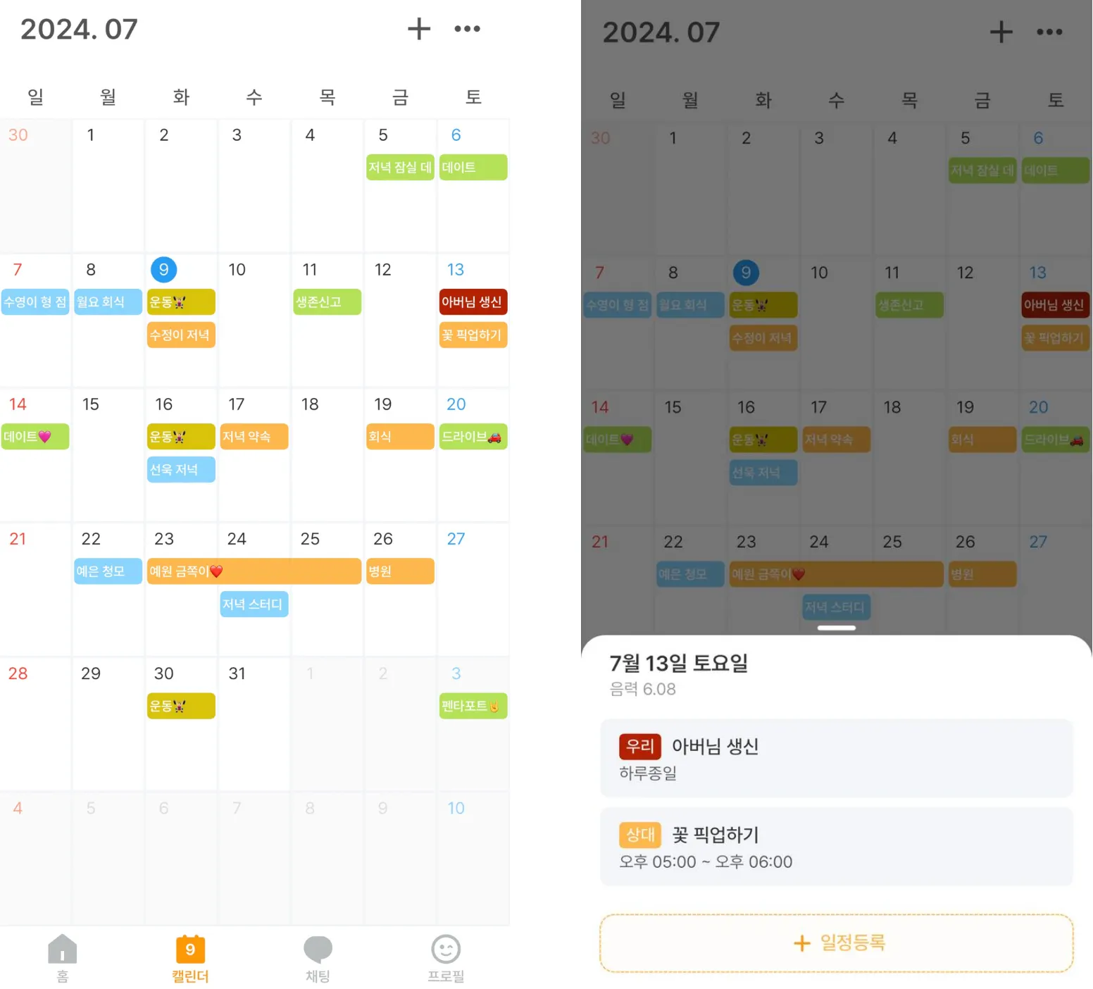 (좌) 색상이 설정된 캘린더 화면 예시 / (우) 색상이 설정된 일정 목록 예시
